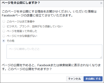 「Facebookページの公開設定」の項目で、「公開をやめる」を選択すると、非公開設定完了です。