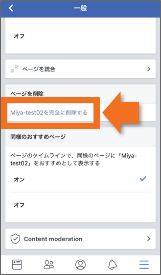 「●●を完全に削除する」というテキストを選択。●●の部分には、Facebookページ名が入ります。