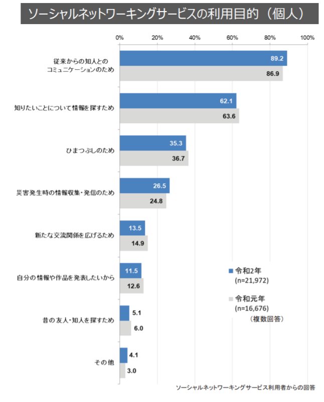SNSについては補足として、総務省の「令和2年通信利用動向調査の結果」からもデータをひとつ、紹介しておきましょう。
