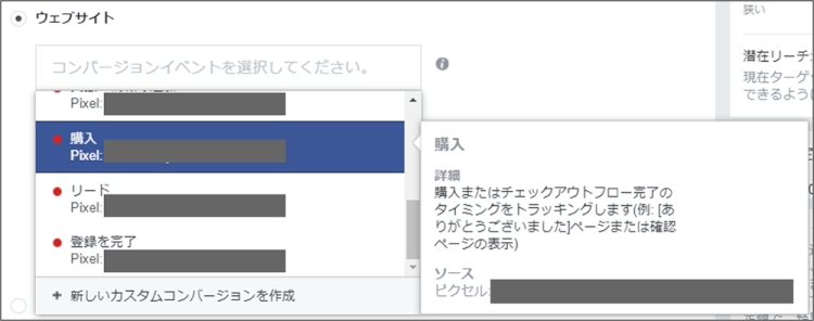 現時点では、Facebookピクセルの設定が完了していないので、仮で「購入」や「登録を完了」などを選択していただいて問題ありません。