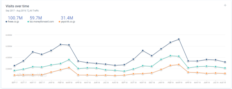 そこで「会計ソフト」の中でもどのソフトがシェアをとっているのか、伸ばしているのかという点について、ここではキーワードを限定せず、SimilarWebのウェブサイト分析を活用して、上記ドメインのトラフィック推移について確認していきましょう。
