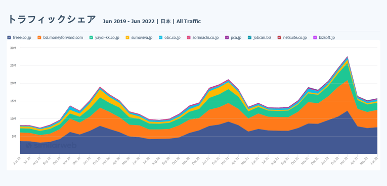 そこでまず、クラウド会計ソフト各社のサイトのトラフィック推移を確認してみます。下のチャートは、主要サービス10社のドメイン全体の過去3年間(2019年6月〜2022年6月)のトラフィックをシミラーウェブを使って抽出したものです。