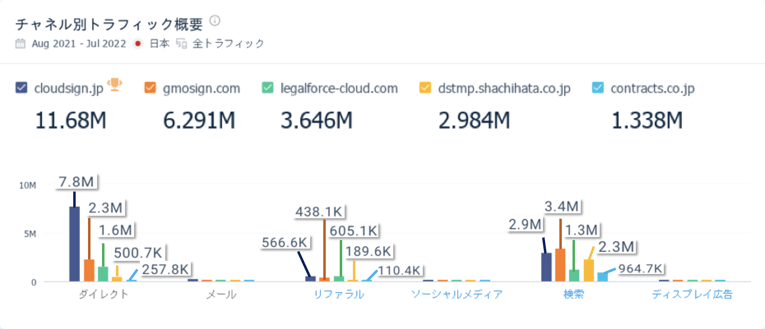 最初のチャートはチャネル別の総訪問数です。まずダイレクトチャネルですが、クラウドサインが圧倒的なトラフィックを獲得しています。2番手のGMOサイン、3番手のAI契約審査プラットフォームと比較しても3倍以上のトラフィックで、契約ユーザー数という点で大きくリードしていることを示唆しています。また、シヤチハタクラウドとContractS CLMのダイレクトトラフィックが少ないのは、利用者向けのサイトを別のドメインで運用しており、サービス利用に伴うアクセスが含まれていないためです。