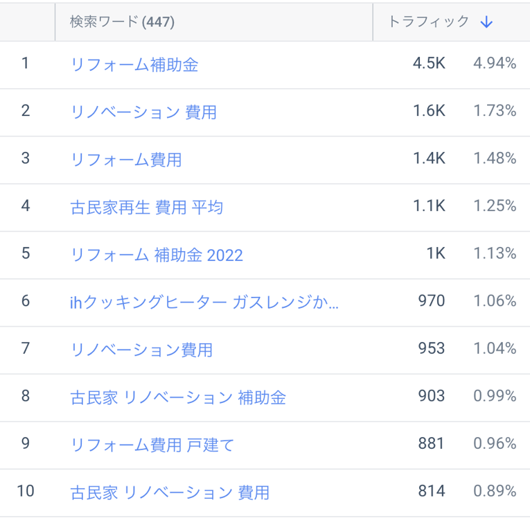 細かい修繕などにリフォームに関連する検索キーワードで費用を含むものは、数は多いのですが、検索トラフィックのボリュームとしてはそれほど多くない印象です。