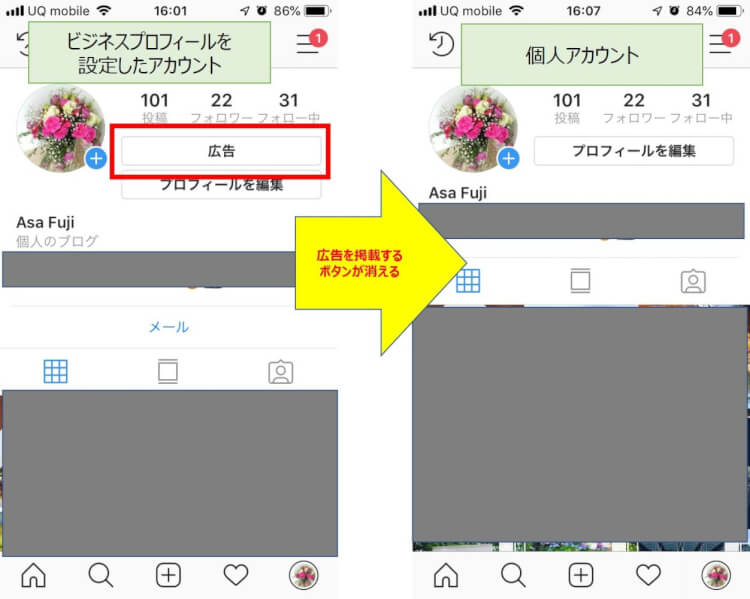 4. ビジネスプロフィールを設定したアカウントに表示されていた「広告」のボタンなどが消え、個人アカウントに切り替えられます。