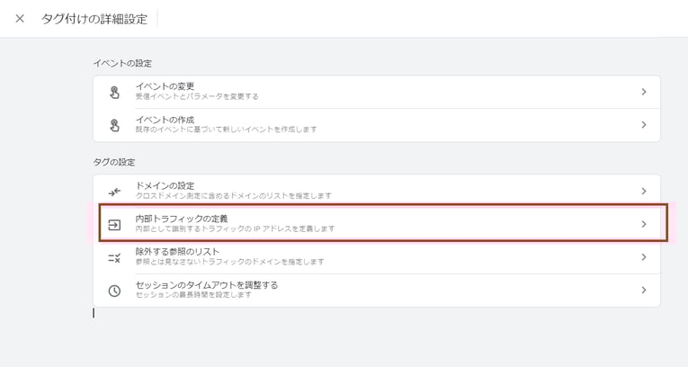 「タグの設定」項目に「内部トラフィックの定義」というのがありますので、それをクリックします。