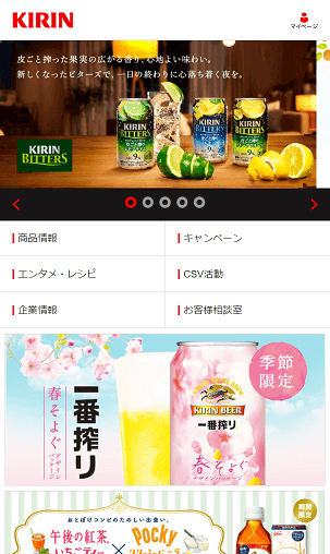 キリン株式会社のスマホサイトは、メニューを表に表示させる形になっています。