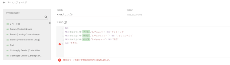 CASEはこうやって条件と合致するものを返すための関数です。この例では無数にあるページを、「サイトトップ」「ショップカテゴリ」「商品」「その他」という四つに分けています。