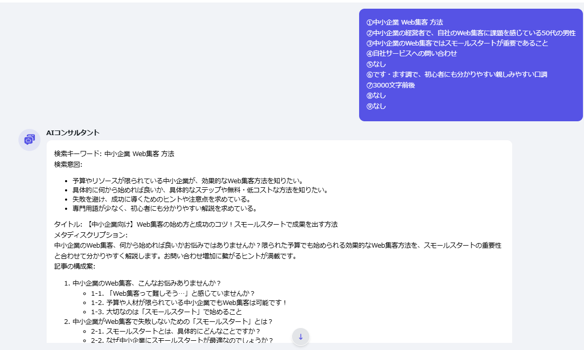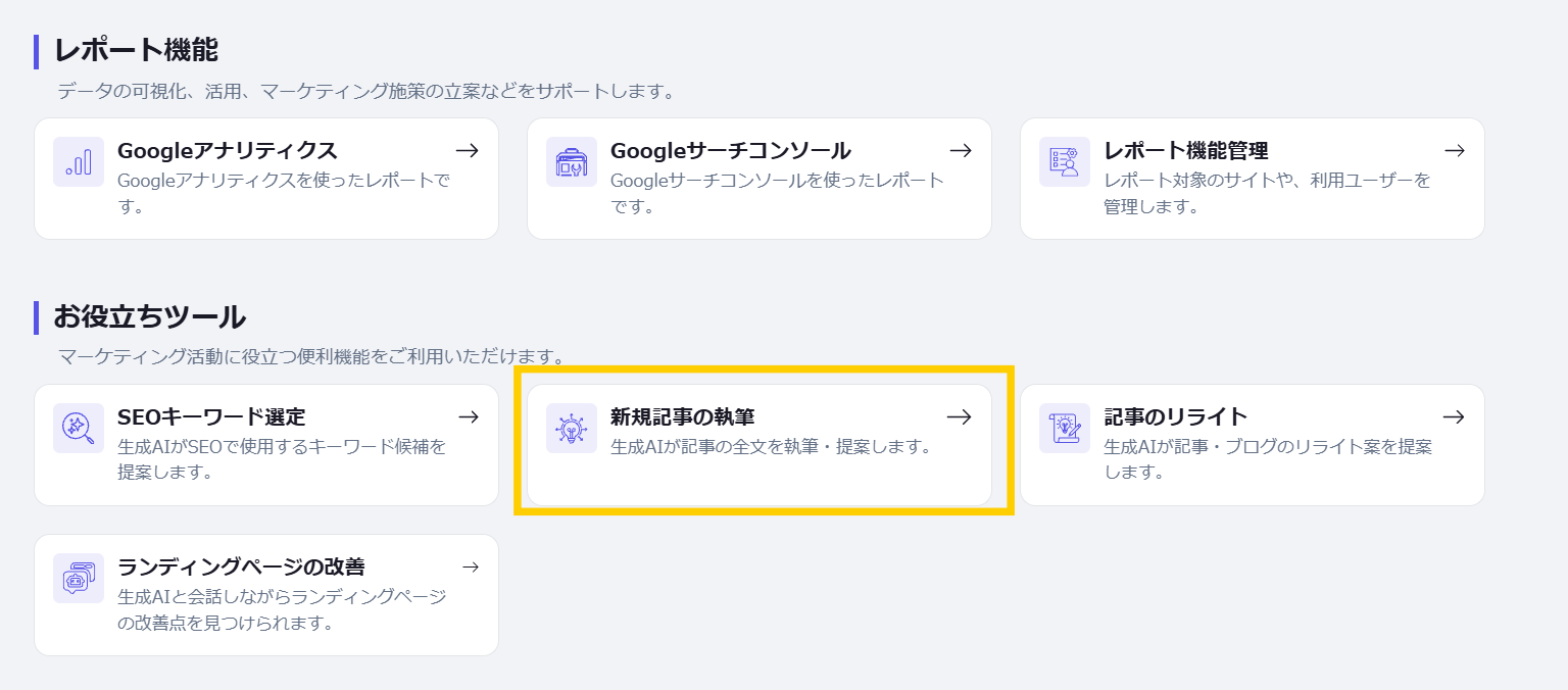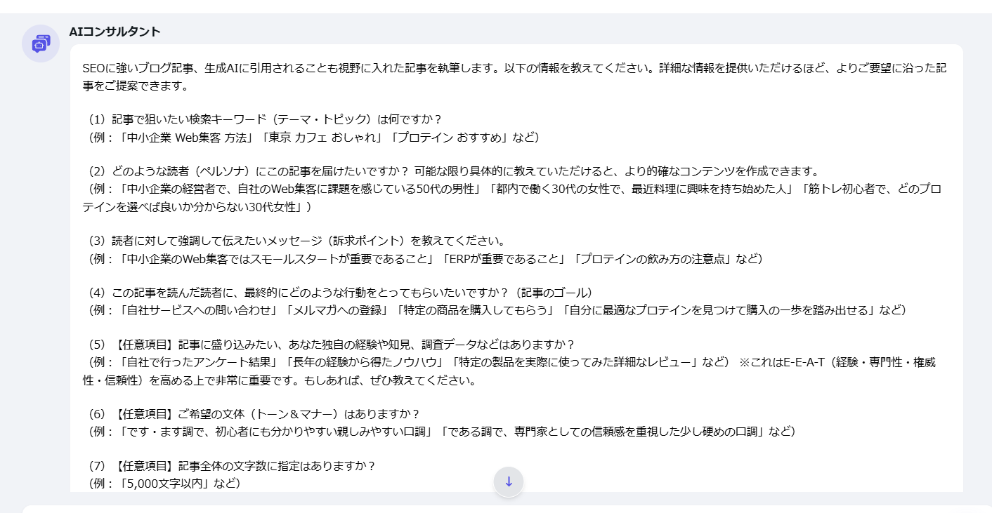 お役立ちツール 公開日: 2026.01.20 更新日: 2026.01.20 編集者: リードプラス編集部 このページでわかること 「新規記事の執筆」の説明ページです。 ターゲットキーワードやペルソナ、訴求ポイントを入力するだけで、生成AIがブログ記事を自動生成します。 目次 操作手順 1.新規記事の執筆を選択 2.キーワード、ペルソナ等の入力 9つの質問項目が表示されているため、それぞれに回答していきます。 3.記事の構成案の確認 質問への回答後、ブログ記事のタイトルと構成案が表示されるため、内容を確認します。修正が必要な場合は、AIコンサルタントと会話しながら調整します。 問題なければ、AIコンサルタントに「OK」など了承の旨を伝えると、記事全文の作成が開始されます。 作成完了後、本文をコピーしてお使いください。 一覧に戻る