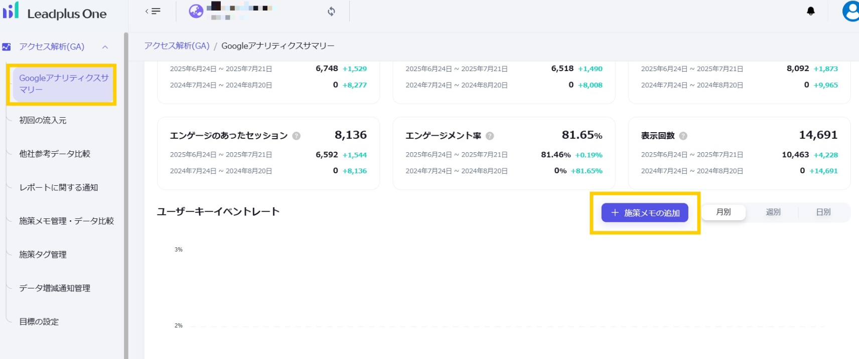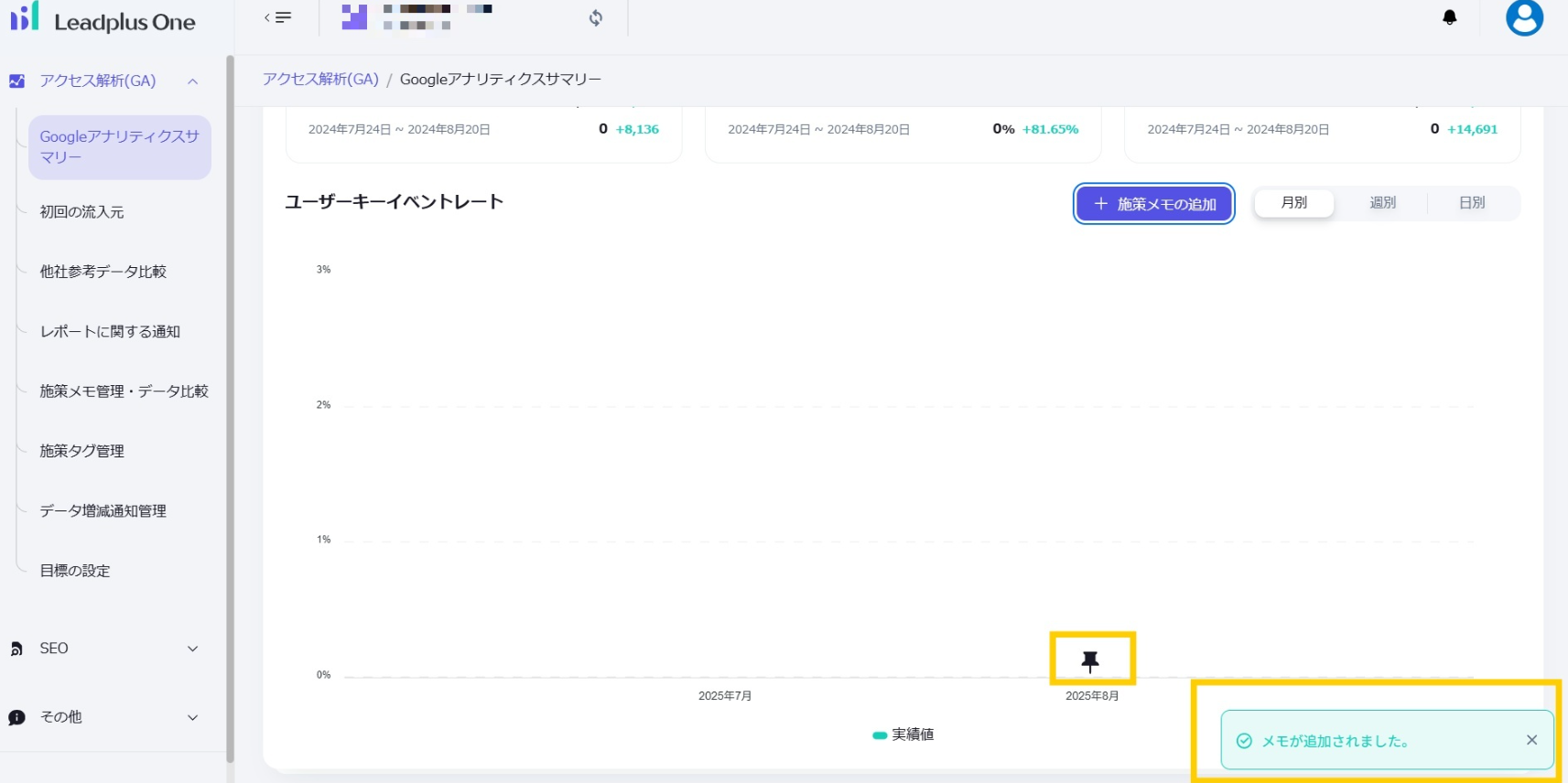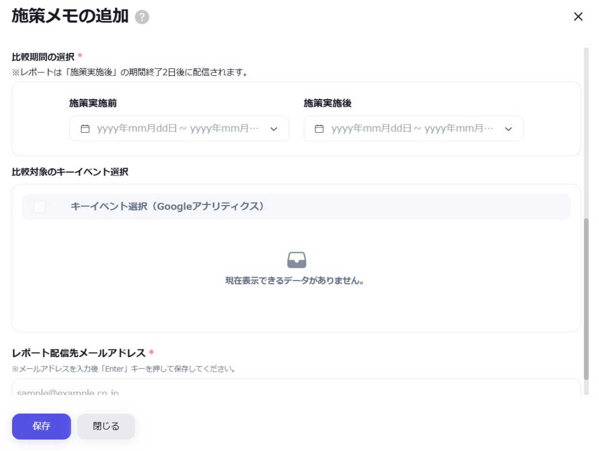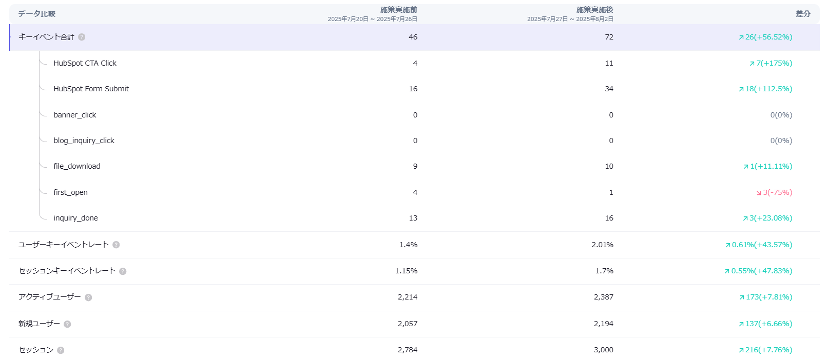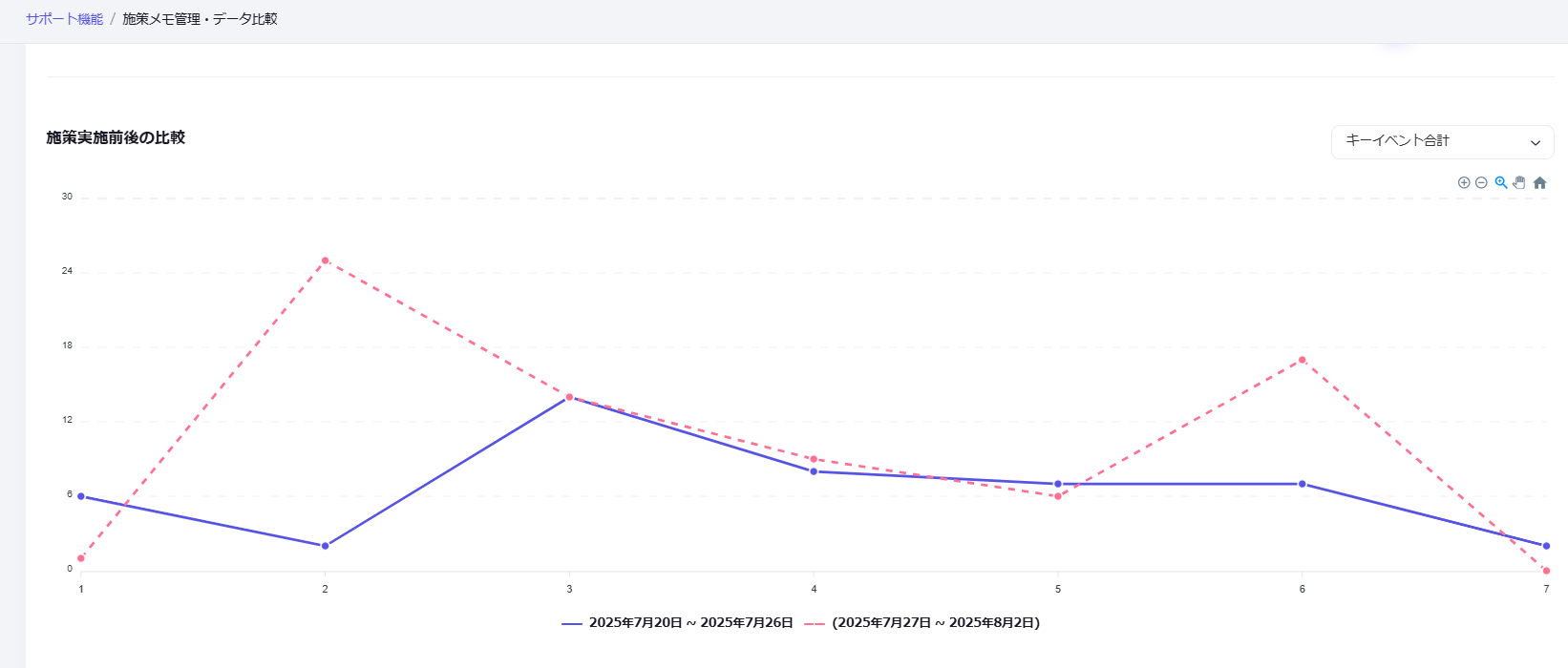 └「施策実施前」で選択した期間の間にGoogleアナリティクス管理画面で登録されていたキーイベントが表示されます
