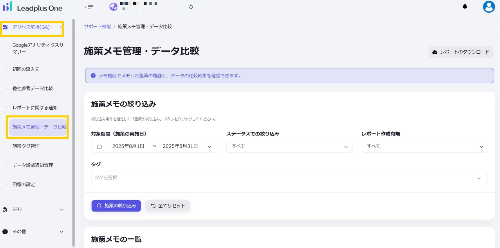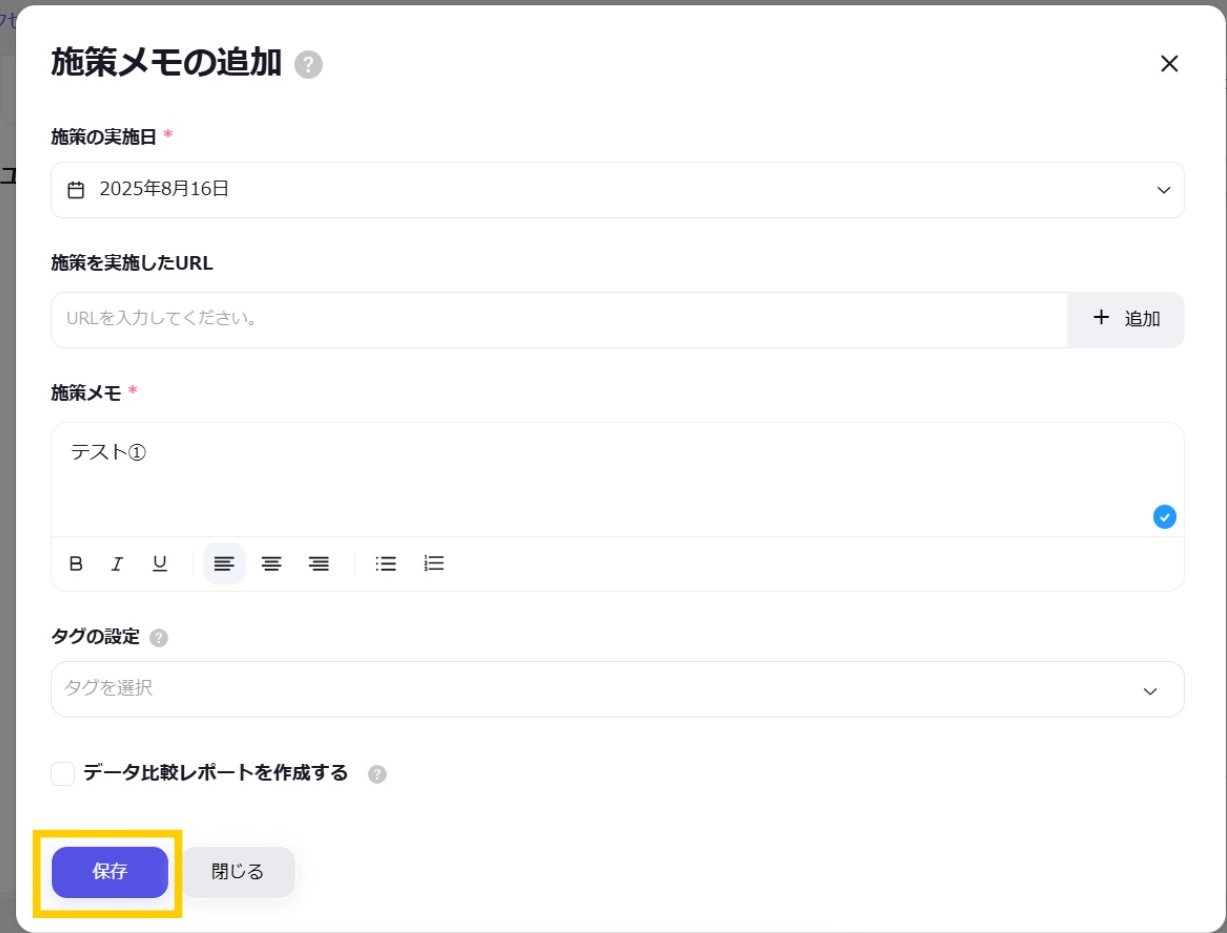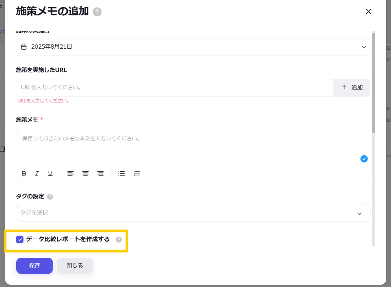 このメモに関するレポートを作成したい場合は、「データ比較レポートを作成する」にチェックを入れます。