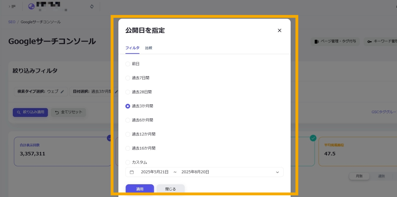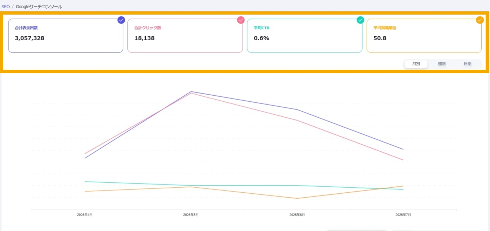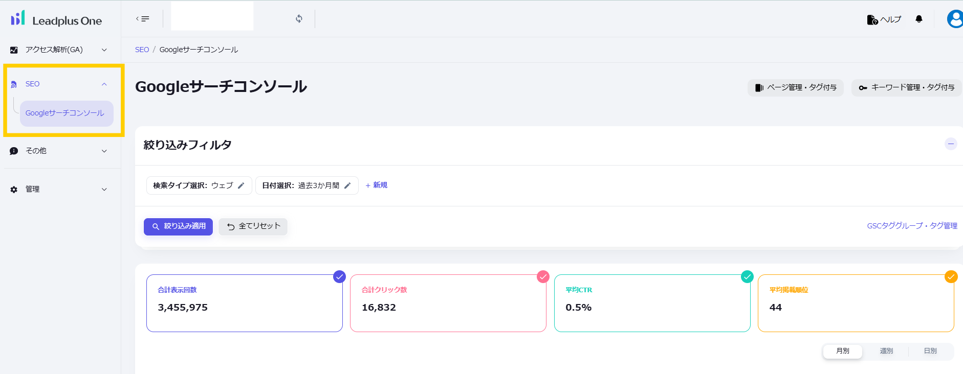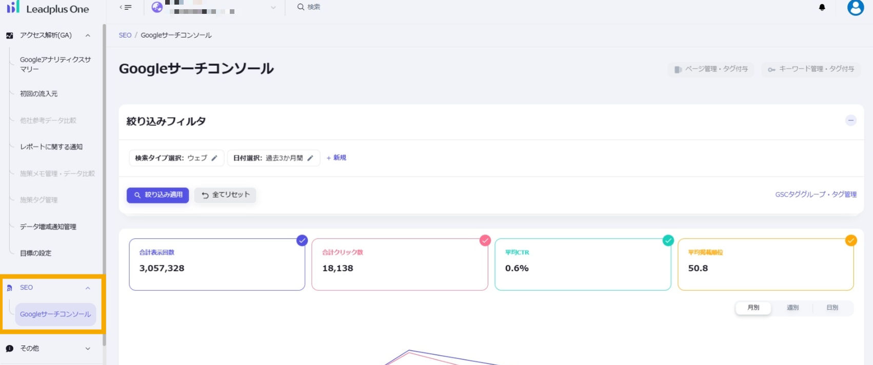 公開日: 2025.09.18 更新日: 2025.10.07 編集者: リードプラス編集部 このページでわかること Leadplus One WebアプリにGoogleサーチコンソールを連携することで、サイトの検索結果情報を確認することができます。 目次 操作手順 1.Googleサーチコンソール画面にアクセスする 左サイドメニューの「SEO」>「Googleサーチコンソール」をクリックします。 2.絞り込みフィルタ Googleサーチコンソールに表示される情報は、絞り込みフィルタを使ってフィルタリングすることができます。 ▼フィルタ・検索タイプ選択・日付選択・デバイス選択・タグの指定・公開日の指定(ブログ記事などのウェブページを公開した日)・URLの指定・検索キーワードの指定 3.データの見方 画面上では連携したGoogleサーチコンソールの以下のデータが閲覧できます。 ・合計表示回数・合計クリック数・平均CTR・平均掲載順位 これらは各データのカードをクリックすることで表示・非表示の切り替えが可能です。 月別/週別/日別で表示を切り替えることもできます。 グラフの下にはデータの一覧が表示されています。 ページ/検索キーワード/デバイスでの表示の切り替えおよび、表示中のレポートのダウンロードが可能です。 ※公開日の指定について 絞り込みフィルタ>新規>「公開日の指定」で、ブログやサイトページの公開日でデータをカットして見ることができます。 一覧に戻る