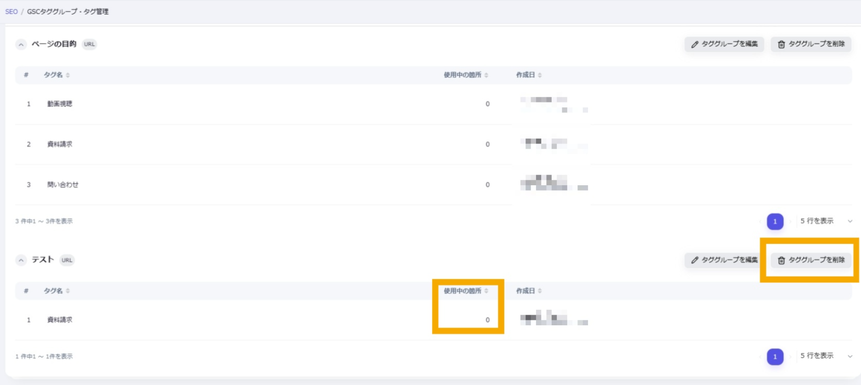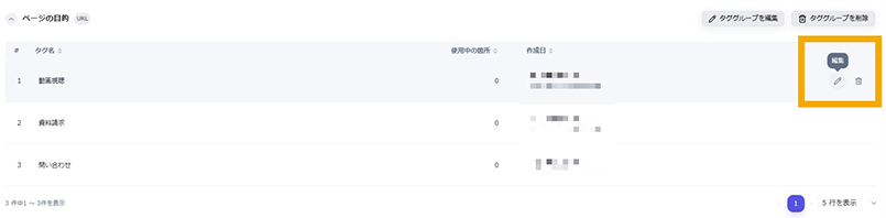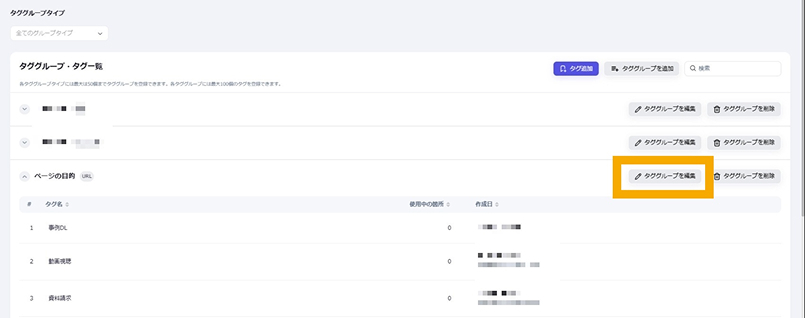 Googleサーチコンソール 公開日: 2025.09.05 更新日: 2025.10.07 編集者: リードプラス編集部 このページでわかること Googleサーチコンソールの「タググループ・タグ管理」の説明ページです。Googleサーチコンソールを利用して確認できる、サイトの検索キーワードや各ページに対してタググループというLeadplus One独自の属性を付与して管理することができます。 目次 操作手順 1.タググループの編集 タググループの編集を行いたい場合は、該当のタググループの右側にある「タググループの編集」ボタンをクリックします。 ①「タググループを編集」が開いたら、新規作成時と同じように入力します。②「保存」ボタンをクリックすると保存が完了します。 2.タググループの削除 タググループの削除を行いたい場合は、「タググループを削除」ボタンをクリックします。 ※使用中のタググループはこのようなポップアップが表示されます。 削除しても問題がないか、しっかりとご確認いただいたうえで削除することを推奨いたします。 3.タグの編集 タグの編集を行いたい場合は、タグにカーソルを合わせると表示される鉛筆マークをクリックします。 ①「タグ編集の編集」が開いたら、新規作成時と同じように情報を入力します。②「保存」ボタンをクリックすると保存が完了します。 4.タグの削除 タグの削除を行いたい場合は、タグにカーソルを合わせると表示されるごみ箱マークをクリックします。 ※使用中のタグはこのようなポップアップが表示されます。 削除しても問題がないか、しっかりとご確認いただいたうえで削除することを推奨いたします。 一覧に戻る