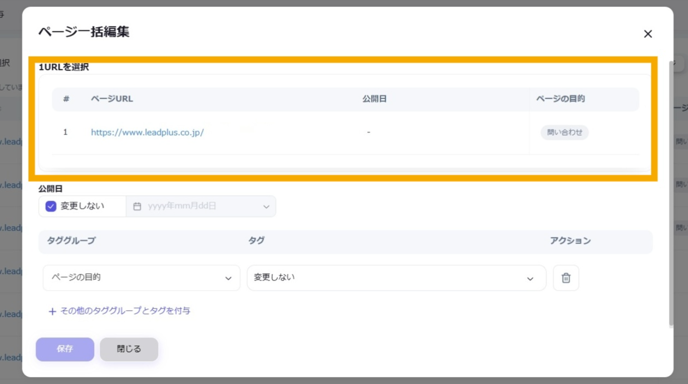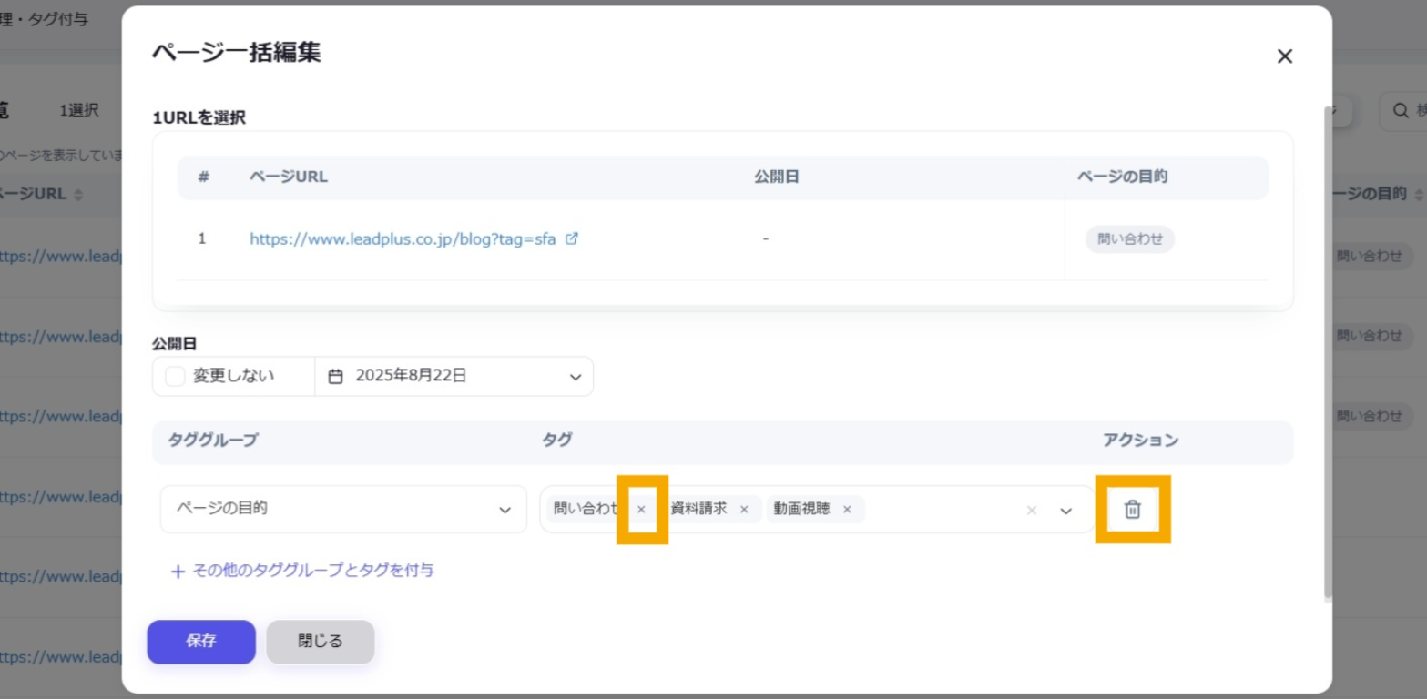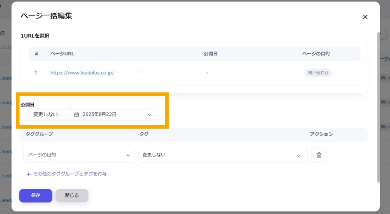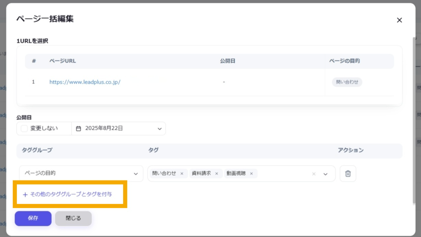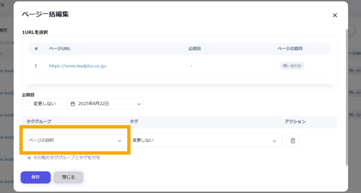 公開日: 2025.09.18 更新日: 2025.10.07 編集者: リードプラス編集部 このページでわかること サイトの各ページ(=URL)に対して独自のタグを付与すると、タグ別に情報を管理することができます。 注意 事前作業として「【Googleサーチコンソール②】タググループ・タグを作成したい」の対応が必要になります。 目次 操作手順 1.「ページ管理・タグ付与」画面を開く 左サイドメニューの「SEO」>「Googleサーチコンソール」>「ページ管理・タグ付与」をクリックします。 2.URLの指定 ページ一覧からタグをつけたいURLを探し、左側のチェックボックスにチェックを入れます。 3.一括編集ボタンをクリック チェックが完了したら、「一括編集」ボタンをクリックします。 4.URLの確認 ページ一括編集のタブが開いたら、選択したURLが正しく表示されていることを確認します。 5.タグ付与時の公開日設定 タグ付与時に同時に公開日を変更したい場合は、公開日の「変更しない」のチェックを外し、日付を指定します。 変更しない場合はチェックを入れたままにします。 6.タググループの選択 タググループ>プルダウンから選択します。タグのプルダウンから、タググループ内のタグのリストが表示されるため、付与したいタグを選択します。 ※複数のタググループのタグ追加 複数のタググループのタグを追加したい場合は、「その他のタググループとタグを付与」から選択可能です。 付与したいタググループとタグを選択できたら「保存」ボタンをクリックします。 ※タグ・タググループの削除 不要なタグ。タググループは下記より、それぞれ削除が可能です。 タグ:タグの右にある×ボタンタググループ:タググループの右にあるごみ箱ボタン 7.ページにタグを付与する 一括編集に成功すると、画面右下に「ページが一括編集されました」の表示が出ます。ページ一覧にも編集内容が即時反映されます。 一覧に戻る