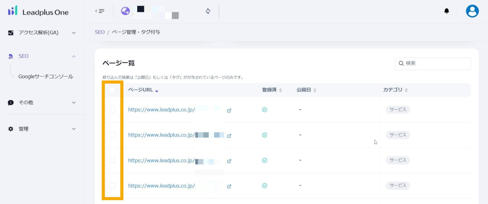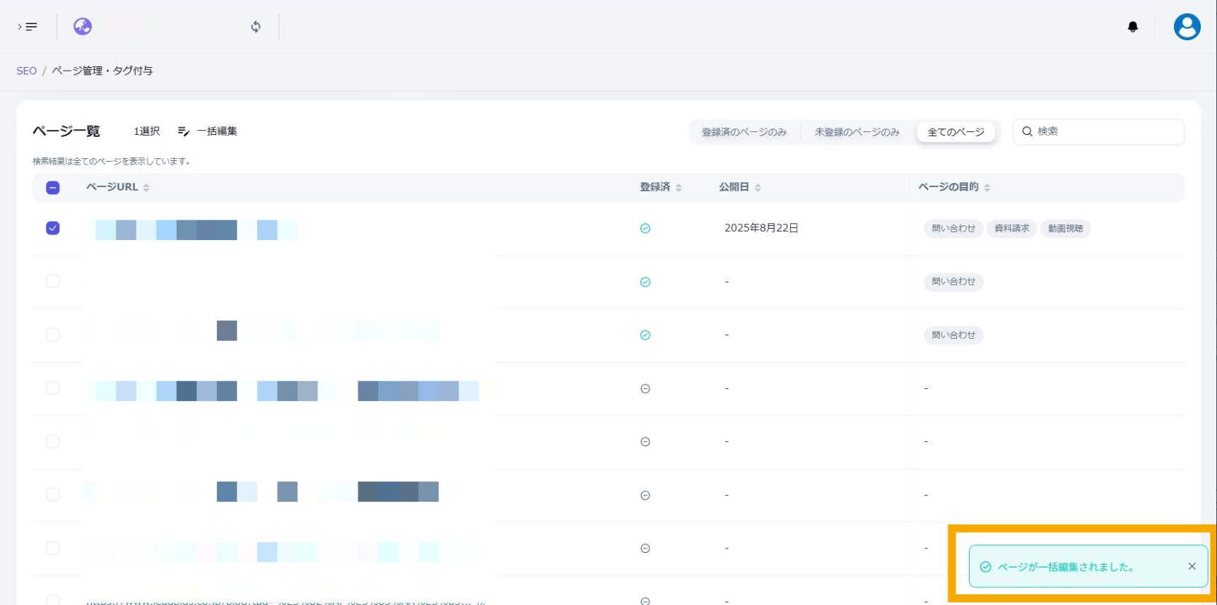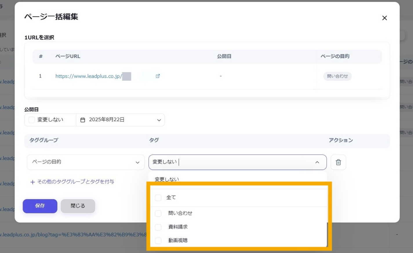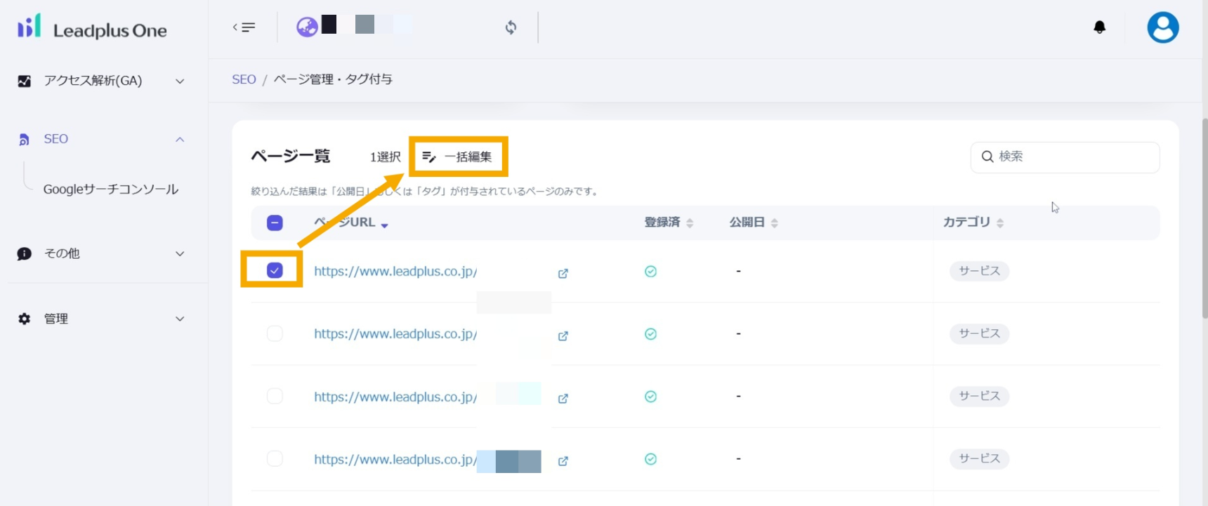公開日: 2025.09.18 更新日: 2025.10.07 編集者: リードプラス編集部 このページでわかること サイトの各ページ(=URL)に対して独自のタグを付与すると、タグ別に情報を管理することができます。 注意 事前作業として「【Googleサーチコンソール②】タググループ・タグを作成したい」の対応が必要になります。 目次 操作手順 1.「ページ管理・タグ付与」画面を開く 左サイドメニューの「SEO」>「Googleサーチコンソール」>「ページ管理・タグ付与」をクリックします。 2.URLの指定 ページ一覧からタグをつけたいURLを探し、左側のチェックボックスにチェックを入れます。 3.一括編集ボタンをクリック チェックが完了したら、「一括編集」ボタンをクリックします。 4.URLの確認 ページ一括編集のタブが開いたら、選択したURLが正しく表示されていることを確認します。 5.タグ付与時の公開日設定 タグ付与時に同時に公開日を変更したい場合は、公開日の「変更しない」のチェックを外し、日付を指定します。 変更しない場合はチェックを入れたままにします。 6.タググループの選択 タググループ>プルダウンから選択します。タグのプルダウンから、タググループ内のタグのリストが表示されるため、付与したいタグを選択します。 ※複数のタググループのタグ追加 複数のタググループのタグを追加したい場合は、「その他のタググループとタグを付与」から選択可能です。 付与したいタググループとタグを選択できたら「保存」ボタンをクリックします。 ※タグ・タググループの削除 不要なタグ。タググループは下記より、それぞれ削除が可能です。 タグ:タグの右にある×ボタンタググループ:タググループの右にあるごみ箱ボタン 7.ページにタグを付与する 一括編集に成功すると、画面右下に「ページが一括編集されました」の表示が出ます。ページ一覧にも編集内容が即時反映されます。 一覧に戻る