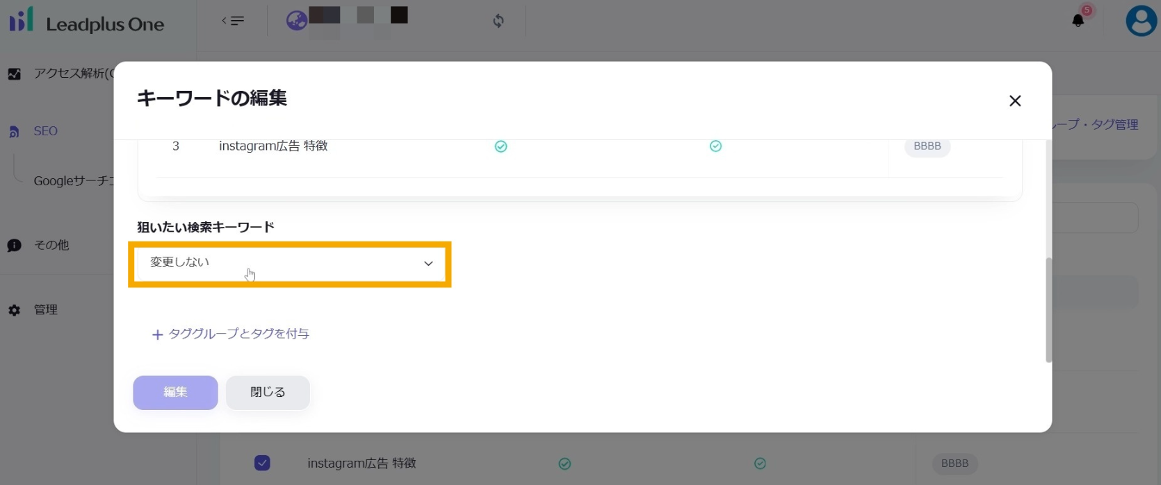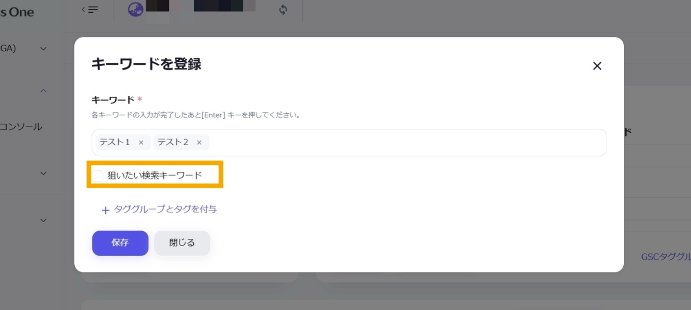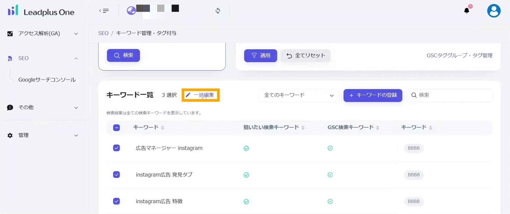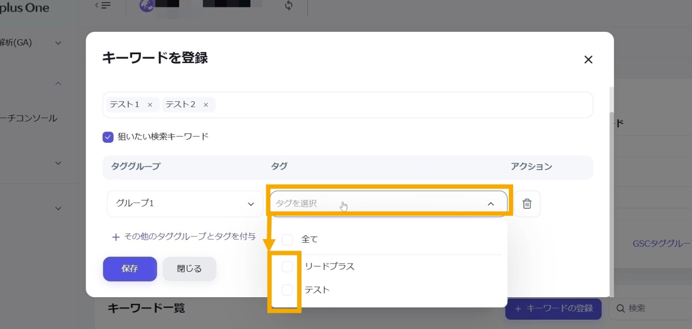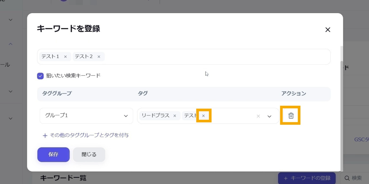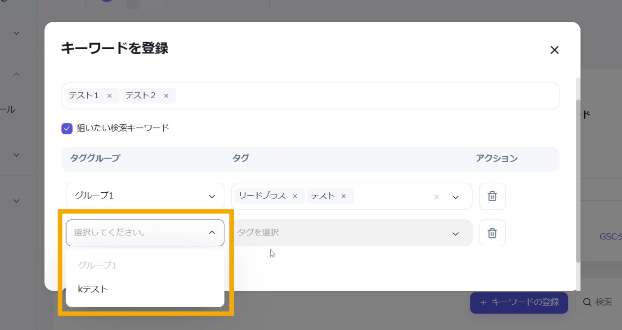 複数キーワードに対して一斉にタグの設定などをすることができます。必要に応じて対象となるキーワードを絞り込むことができます。