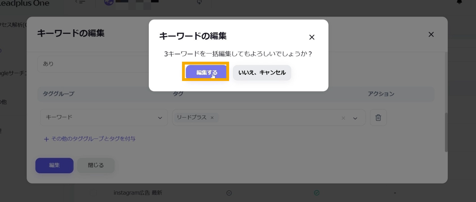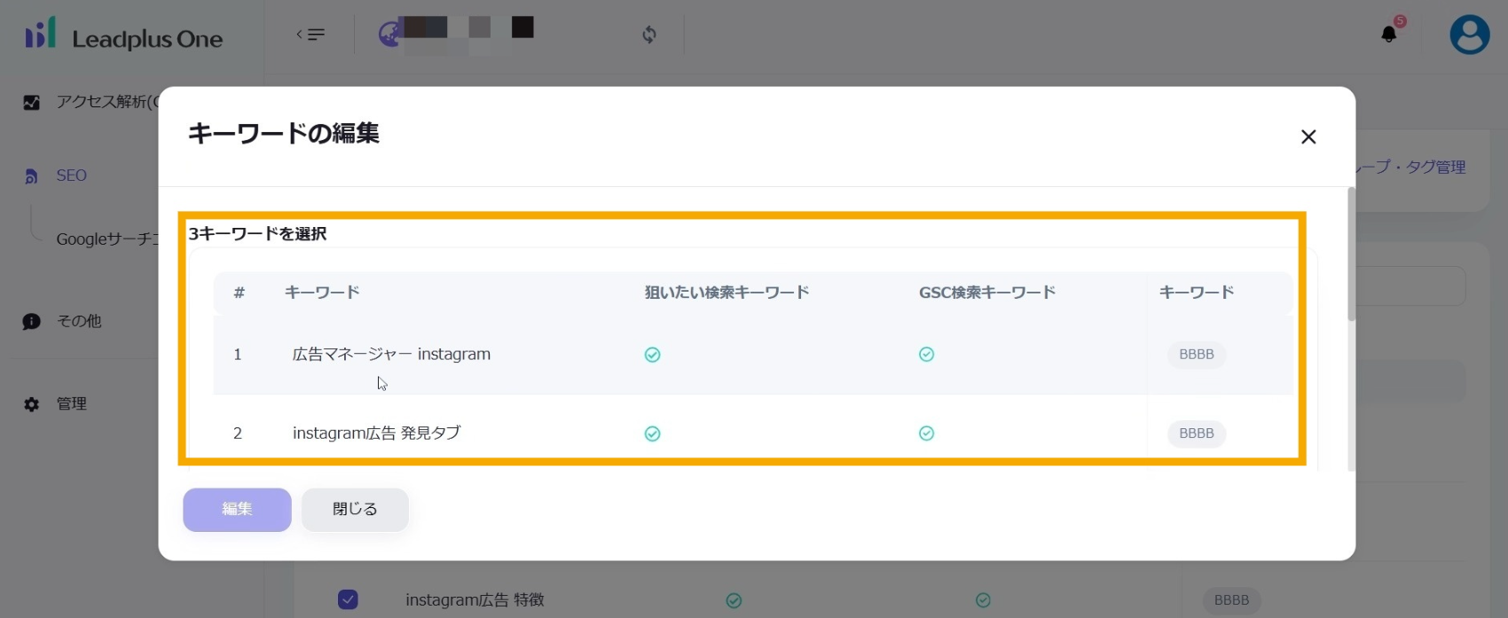 「キーワードの編集」のタブが表示されたら、選択したキーワードがリストに表示されていることを確認します。