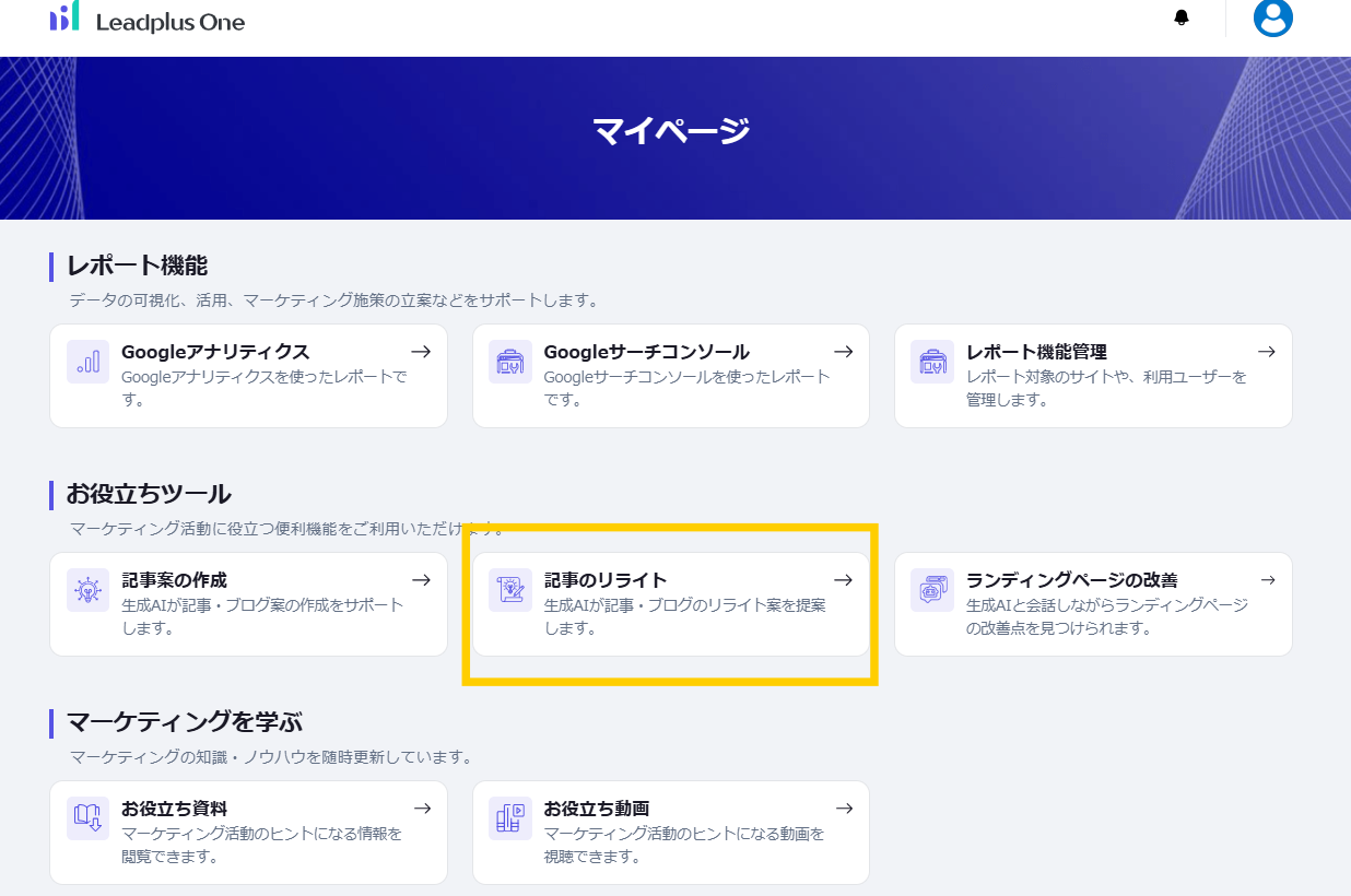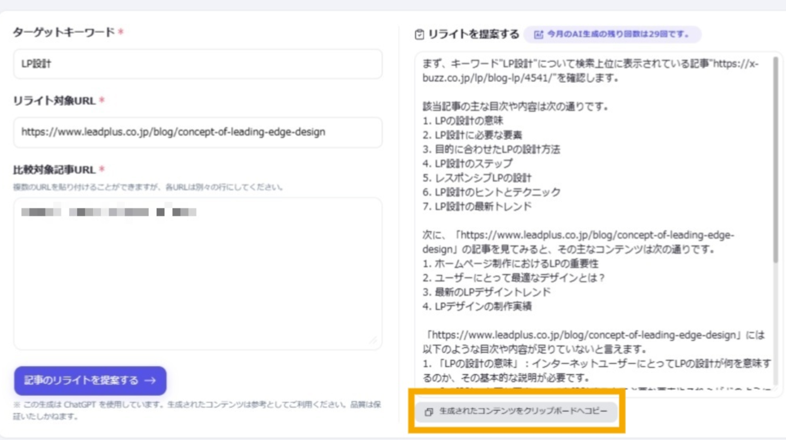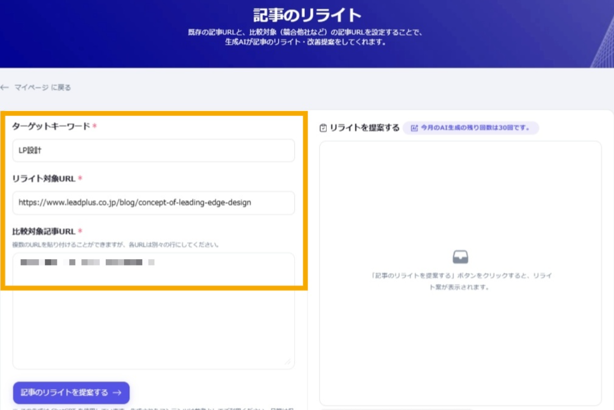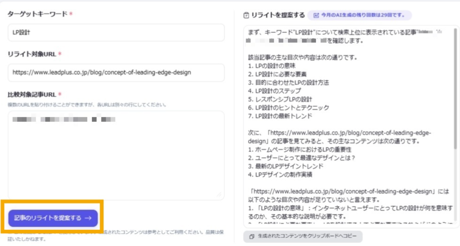 お役立ちツール 公開日: 2025.09.18 更新日: 2025.10.07 編集者: リードプラス編集部 このページでわかること 記事のリライト ターゲットキーワードや比較対象URLを基に、自社コンテンツに不足している見出しや内容を生成し、効果的なリライト案の策定に活用できます。AIでリライト案の生成を行い、SEOに強い記事にしましょう! 記事のリライトでできること リライト案のたたき台を出す 競合と比較し、自社に足りていない内容を抽出してリライト案を考える ※利用回数に上限がありますのでご注意ください。 目次 操作手順 1.「記事のリライト」をクリックする 「マイページ」>「お役立ちツール」>「記事のリライト」を選択します。 2.ターゲットキーワード・対象URLを入力する 下記3つの項目を入力します。①「狙いたいキーワード」(例:「LP設計」)②「リライト対象URL」③「比較対象記事URL」 3.記事のリライト案を生成する 「記事のリライトを提案する」ボタンをクリックすると、右にリライトの提案が表示されます。 「生成されたコンテンツをクリップボードへコピー」をクリックすると、クリップボードへコピーすることができます。 張り付けて、必要に応じてお使いください。 一覧に戻る