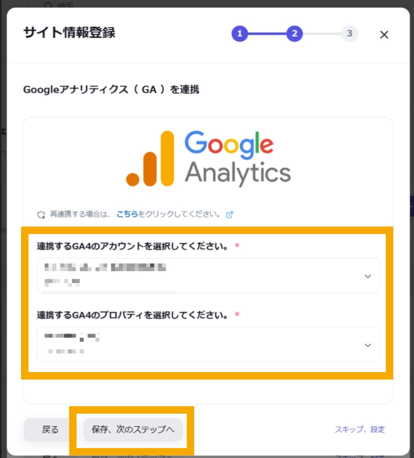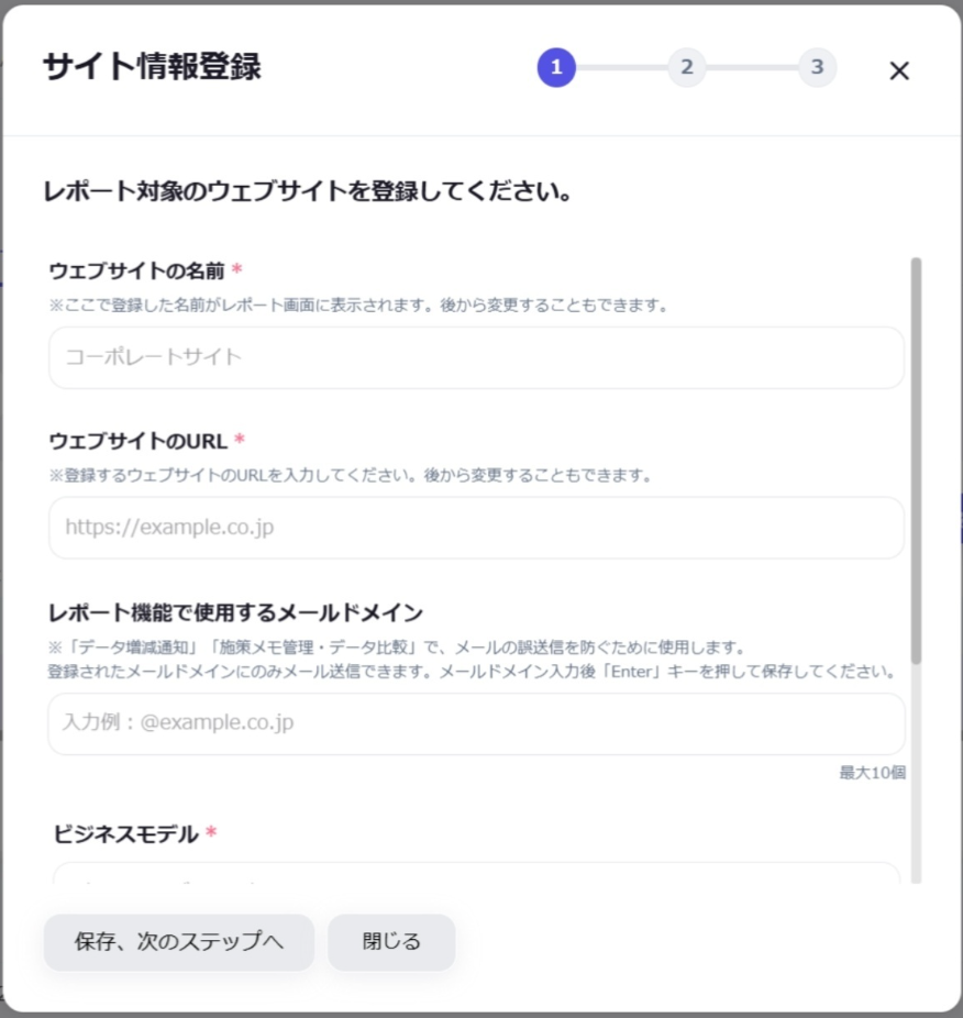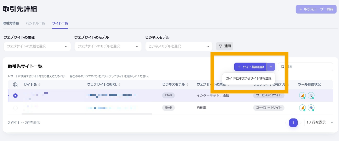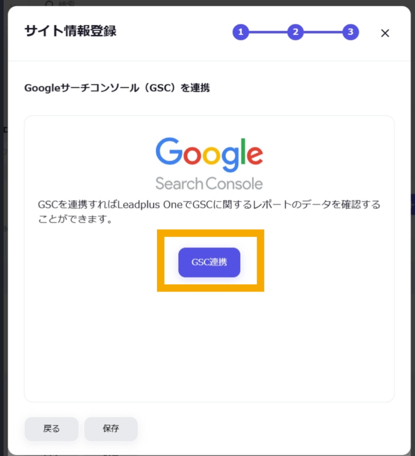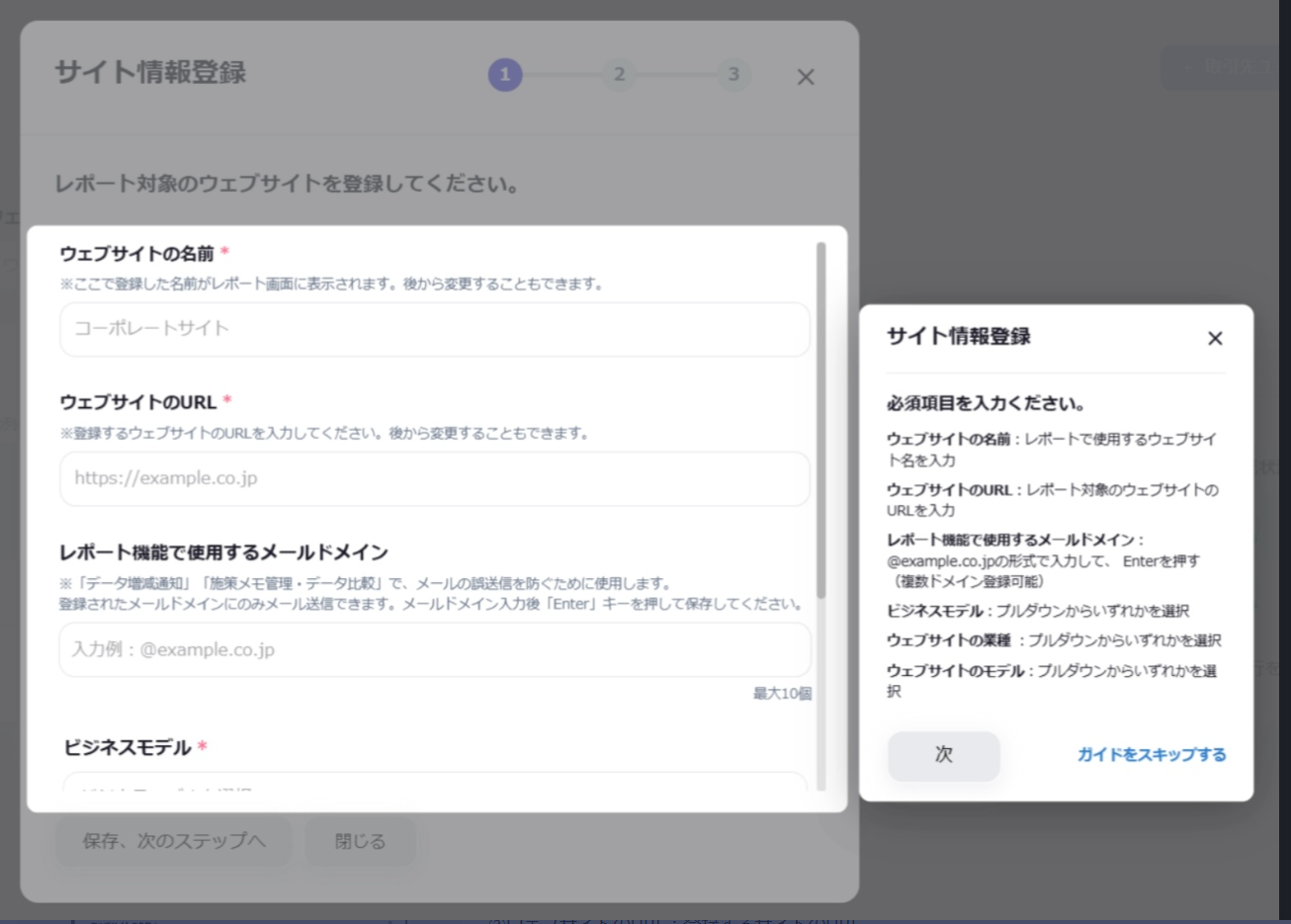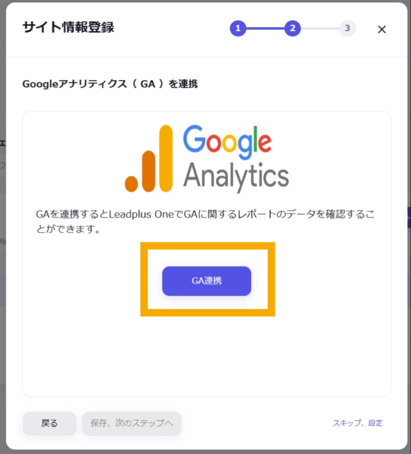 はじめに 公開日: 2025.09.18 更新日: 2025.10.07 編集者: リードプラス編集部 このページでわかること Leadplus One Webアプリのレポート・機能を使用するためには、「サイト」を登録する必要があります。このページでは、「サイト設定」(Googleアナリティクス・Googleサーチコンソールとの連携)の手順を説明します。 目次 操作手順 1.「取引先詳細」を開く 左メニューの「取引先詳細」をクリックすると、 「取引先情報」と「取引先ユーザー一覧」が表示されます。 2.「サイト一覧」を開く 「サイト一覧」タブ>「サイト情報登録」をクリックすると、入力フォームが表示されます。 ※「ガイドを見ながらサイト情報登録」も選ぶことができます。 「サイト情報登録」の右、下矢印アイコンにカーソルを合わせると「ガイドを見ながらサイト情報登録」を選択できます。 ※ガイドはこのように表示されるため、ぜひご活用ください。 3.「サイト情報登録」を入力する 以下項目を入力後、「保存、次のステップへ」をクリックしてください。 ①ウェブサイトの名前:レポートに表示される名称②ウェブサイトのURL:登録するサイトのURL ③レポート機能で使用するメールドメイン:データ増減通知などの際に利用するドメイン ※メールドメインを設定しないとデータ増減通知などで送信先を設定できません。 ④ビジネスモデル⑤ウェブサイトの業種 ⑥ウェブサイトのモデル ※④⑤⑥はプルダウンから選択して入力してください。 4.Googleアナリティクス(GA)を連携する 「保存、次のステップへ」選択後、「Googleアナリティクス(GA)を連携」が表示されるので、Googleアカウントのログイン後に、Googleアナリティクスへログインします。 ※スキップすることもできます。 ※ログイン後、アカウントリクエストの許可をお願いします。 5.連携するアカウントを選択 ①「連携するGA4のアカウント」を選択します。②「連携するGA4のプロパティ」を選択します。③「保存、次のステップへ」をクリックします。 6.Googleサーチコンソール(GSC)を連携する ①「Googleサーチコンソール(GSC)を連携」が表示されます。②GSC連携をクリックします。③Googleアカウントのログイン画面が表示されるので、ログインします。④STEP6と同様に許可対応をお願いします。 ※スキップすることもできます。 7.連携するプロパティを選択 「連携するGSCのプロパティ」を選択後、保存します。 8.完了画面が表示される 「完了」をクリックすると設定が完了します。 一覧に戻る